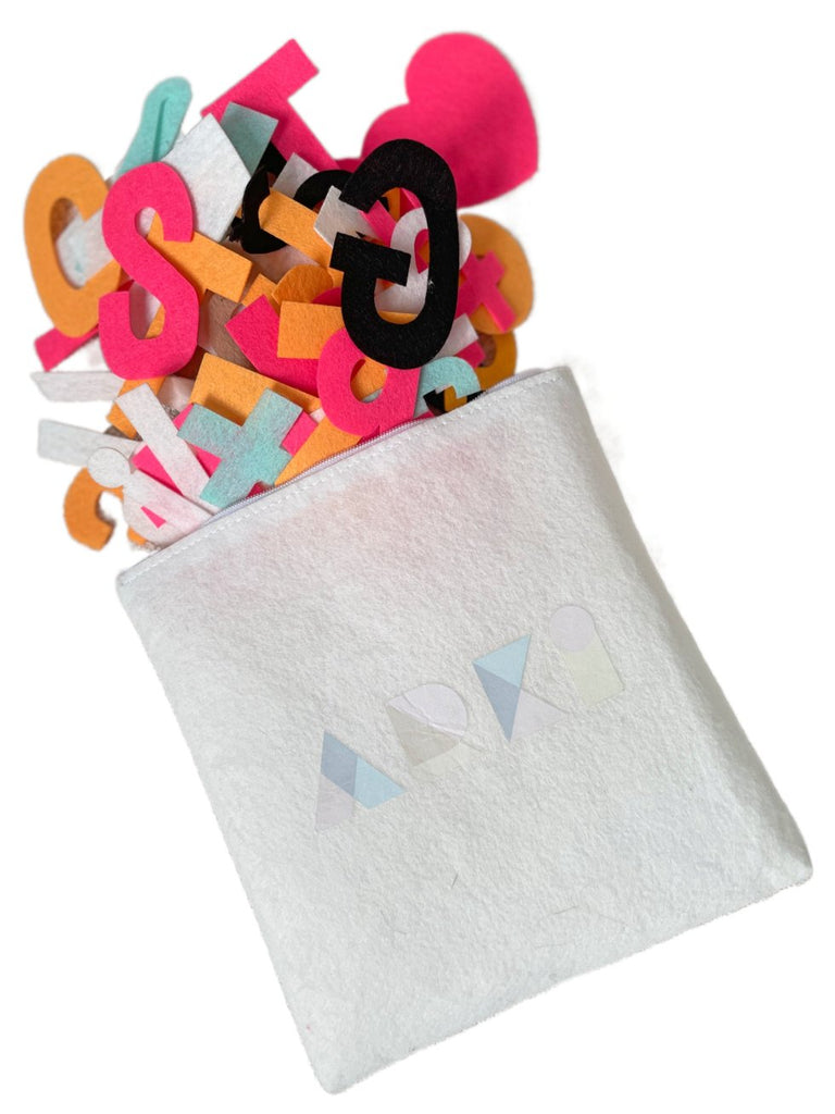 Pack includes 92 letters (upper and lower case), numbers and symbols and arrives in a felt zip bag.