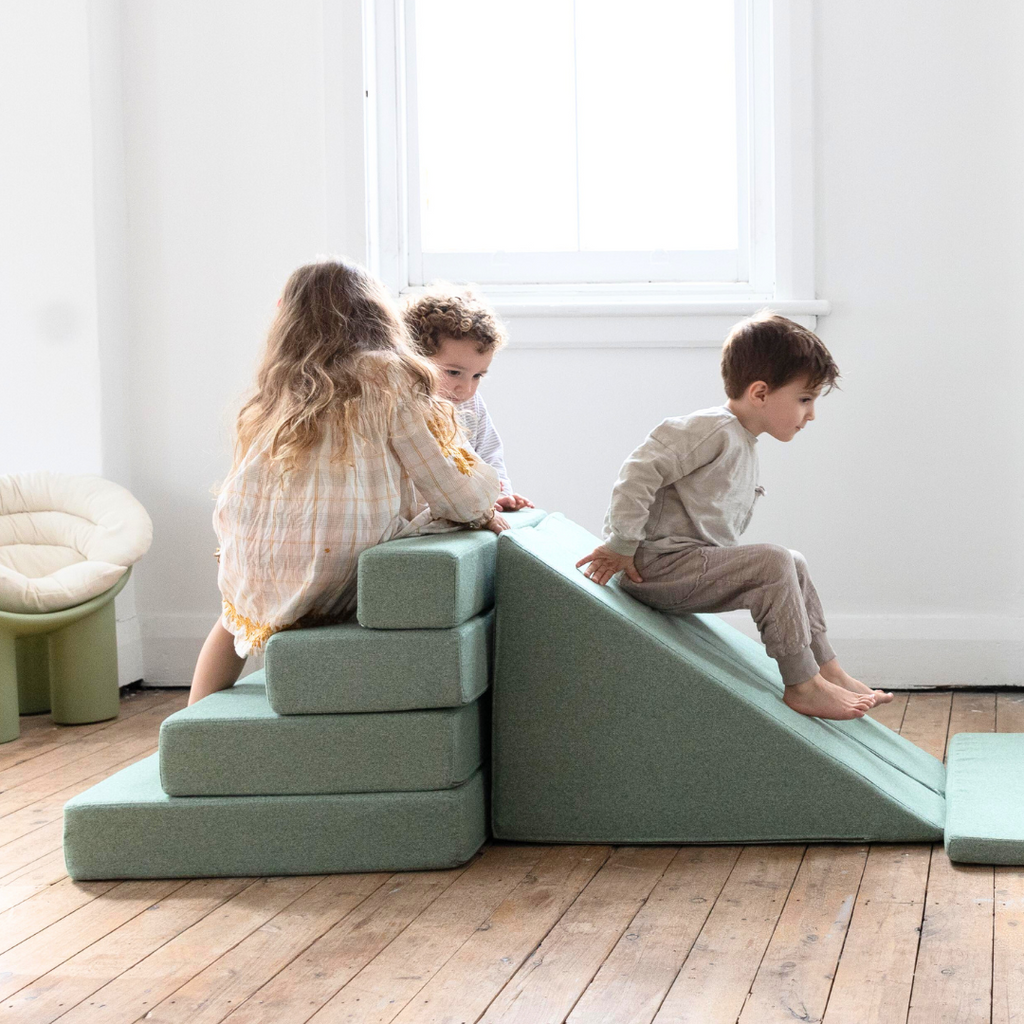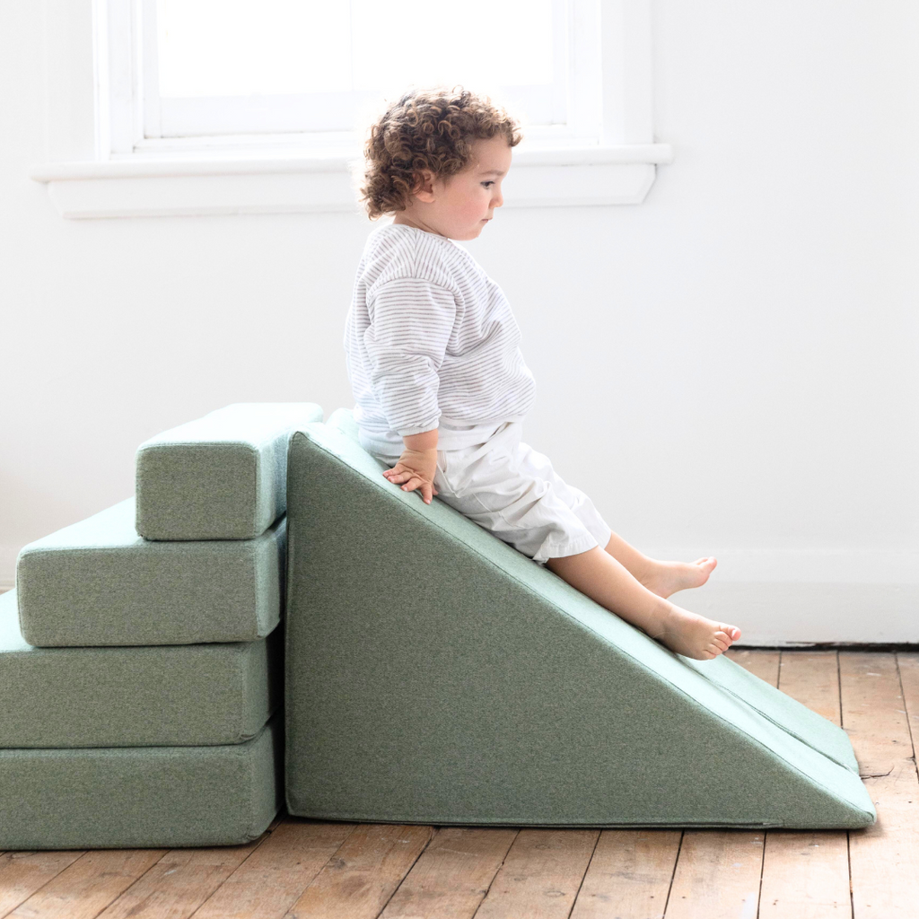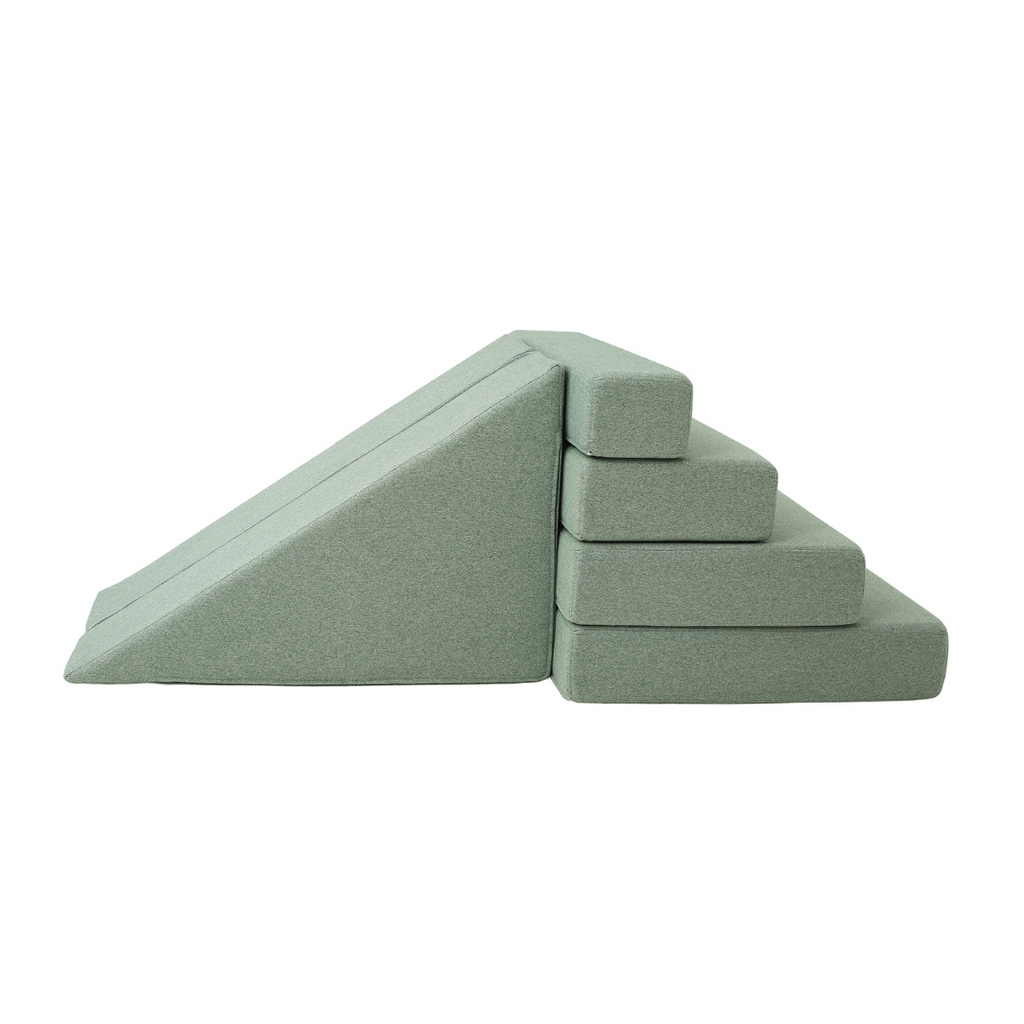 This multifunctional slide conveniently zips together two foam triangle pieces to become a ramp, coffee table, or slide. Team it up with 'The Climber' for even more excitement - a 4 piece foam stair set will keep the party going!